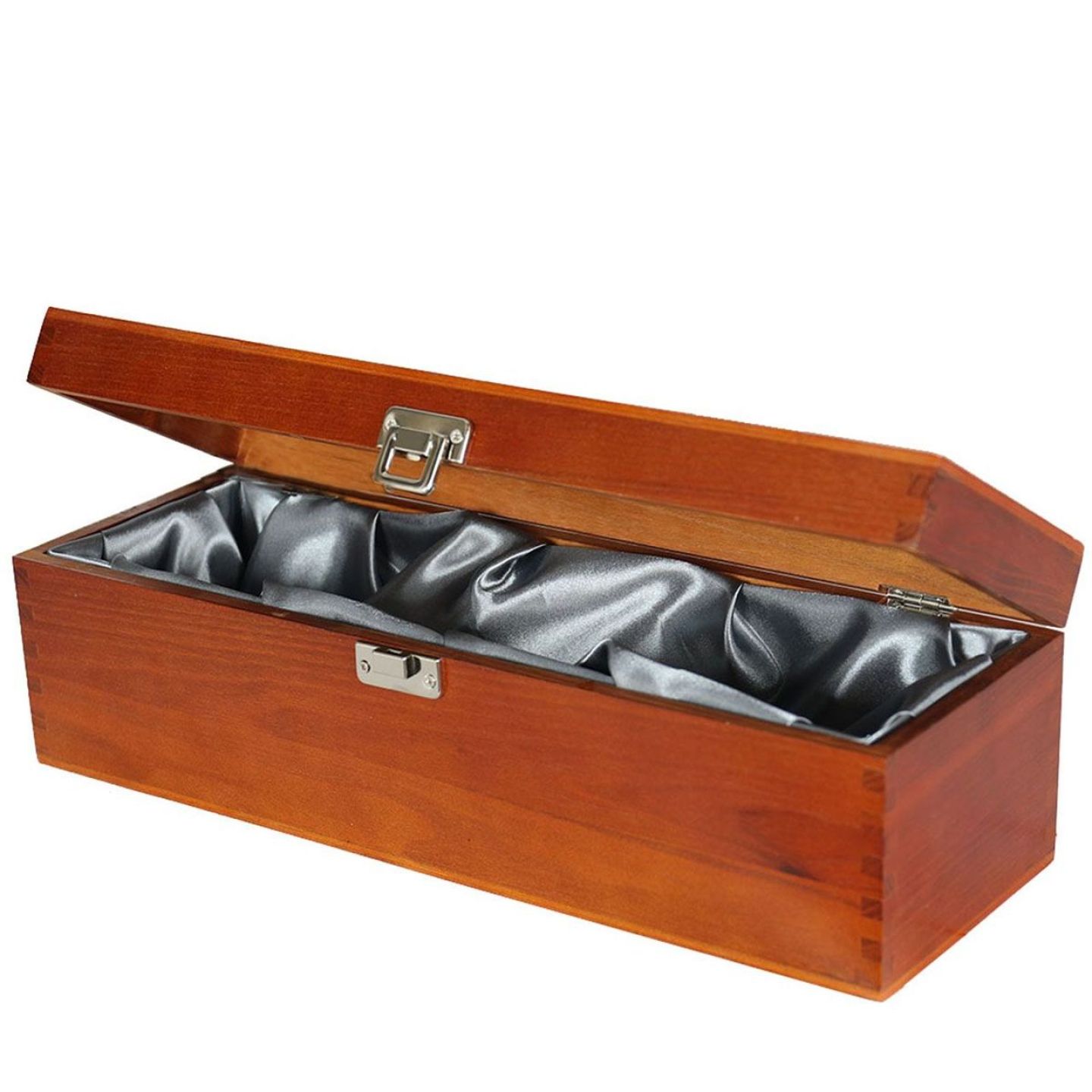 Luxury wooden box with hinges designed to house one standard magnum bottle of wine. It is made from Elm tree with a dark stained finish. It comes with finger joints on the corners, chrome fittings and removable grey silk lining. The overall look and feel of the box is very luxurious and with a bottle of magnum inside will make a wonderful gift for someone special.