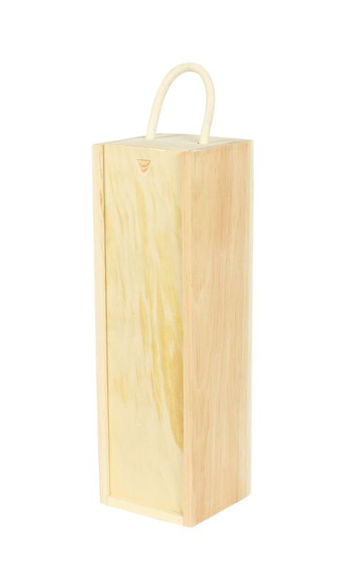 This one-bottle wooden wine box is made from FSC approved pine wood timber that comes from sustainable sources only. This wine box forms part of economy range of sliding lid wooden boxes and consists of a pine wood base, sliding lid and cotton rope handle.