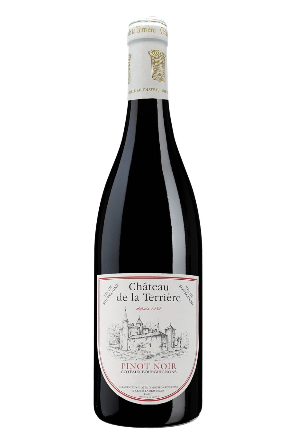Château de la Terrière Pinot Noir Bourgogne Vieilles Vignes is an extraordinary wine produced in the heart of France's Burgundy region. This 100% Pinot Noir wine is made from grapes sourced from the oldest vines (Vieilles Vignes) within the vineyard, resulting in an intense and complex flavor. The deep ruby-red color of this wine with hints of violet pleases the eyes, while its aromas of red fruits arrest the senses. On the palate, the wine reveals layers of flavors such as cherries, raspberries, and a hint of spice, which culminate in a long and lingering finish. This wine is perfect to pair with lamb, beef, duck, or medium to strong cheeses.